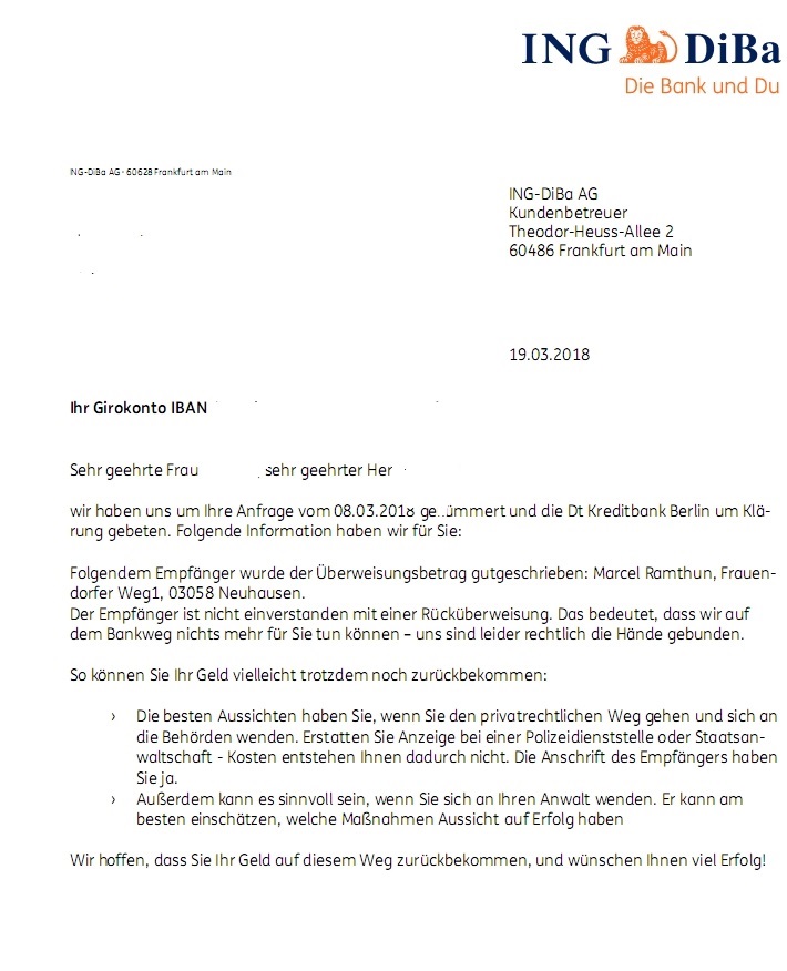 Die deutsche bank versuchte mich zuerst abzuwimmeln, dann erklärte sie sich bereit gegen eine zusatzgebühr von 14,95 euro die sache zu überprüfen (nachforschungsauftrag).